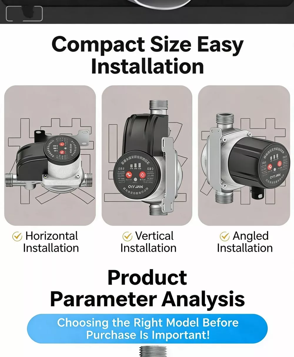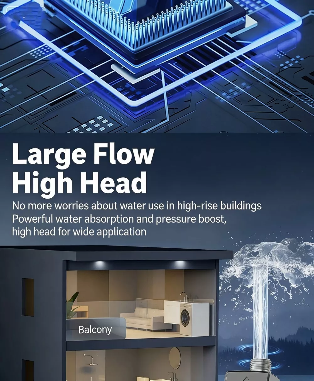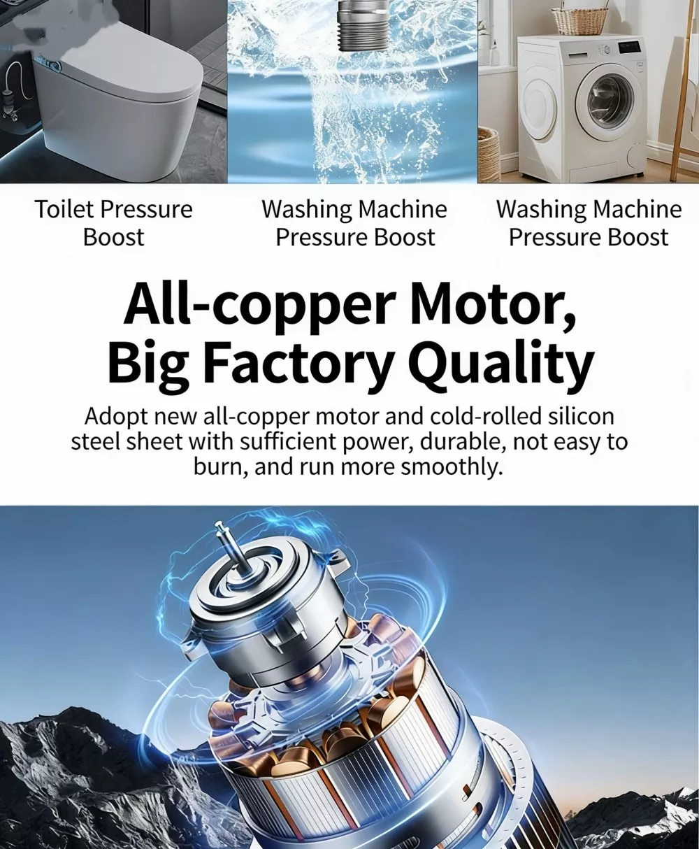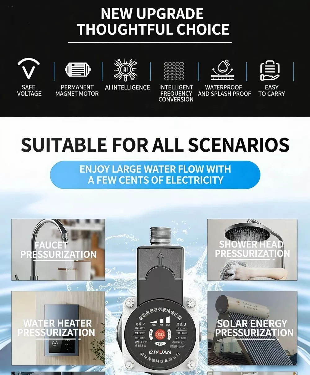 Tăng áp suất đường ống nước máy / năng lượng mặt trời hộ gia đình: Thích ứng với nhiều tình huống cấp nước áp suất thấp khác nhau như đường ống nước máy hộ gia đình và hệ thống cấp nước năng lượng mặt trời, thực hiện tăng áp suất ổn định trong mọi tình huống.