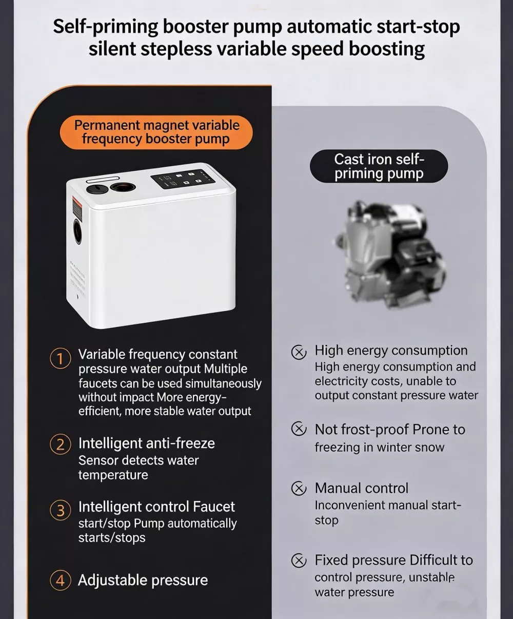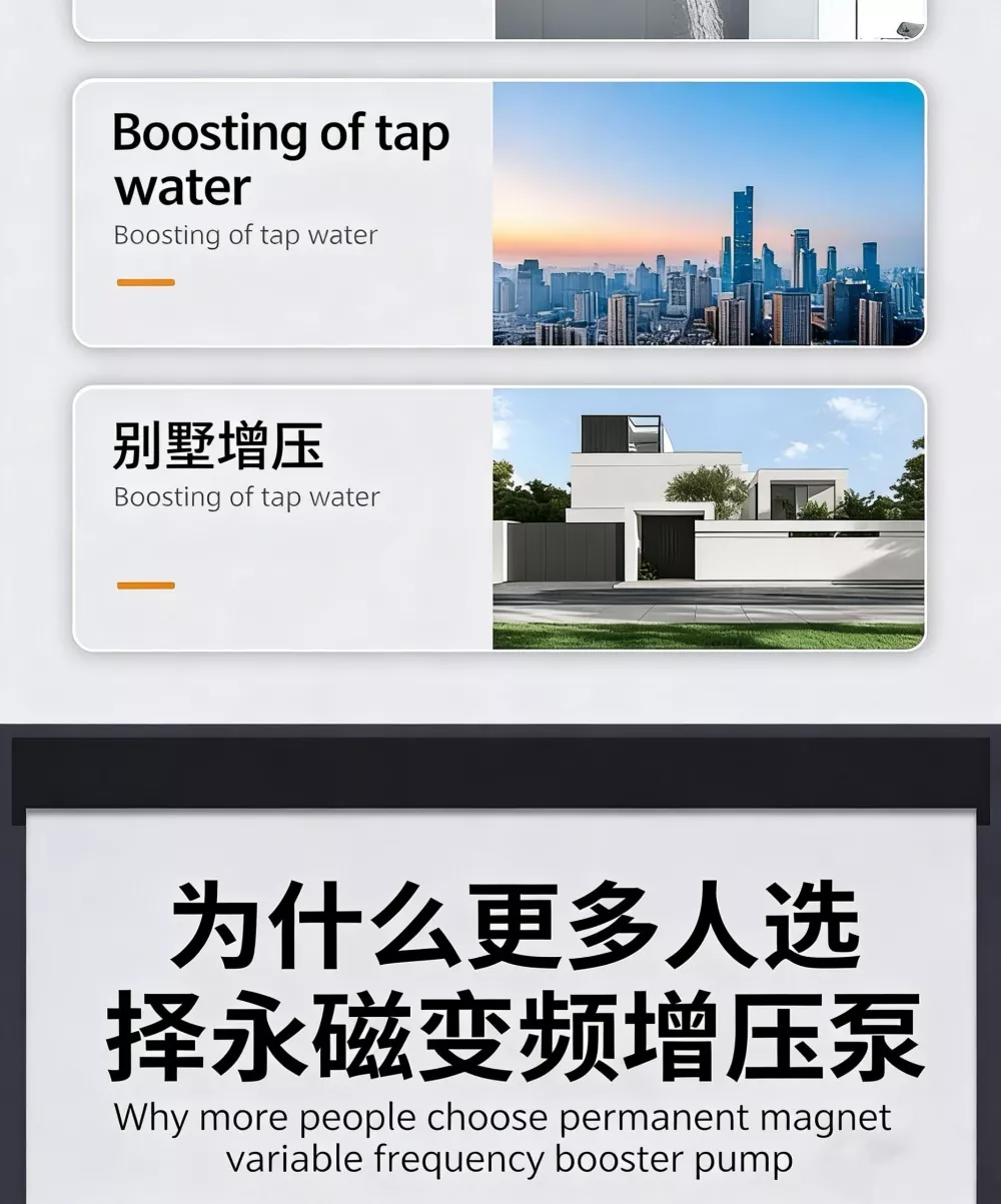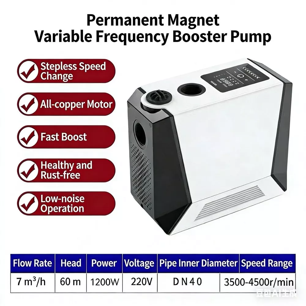 Khi tìm kiếm giải pháp tăng áp lực nước gia đình chất lượng cao thì Máy bơm tăng áp biến tần nam châm vĩnh cửu chính là sự lựa chọn ưu việt của bạn. So với máy bơm tăng áp thông thường trên thị trường, sản phẩm của chúng tôi được trang bị hệ thống điều khiển thông minh hoàn chỉnh, chức năng áp suất không đổi tần số ổn định, thiết kế vận hành ít tiếng ồn, động cơ công suất cao tốc độ cao, bảo vệ chống đóng băng thông minh và kiểu dáng nhỏ gọn. Nó giải quyết hoàn hảo những khuyết điểm thường gặp của máy bơm truyền thống, chẳng hạn như vận hành thủ công rườm rà, áp lực nước không ổn định, độ ồn khi vận hành cao, dễ bị đóng băng trong mùa đông và lắp đặt cồng kềnh, khó khăn.