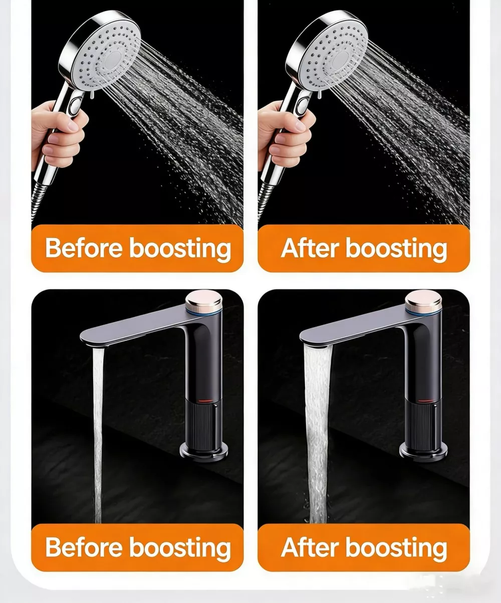 Trước: Nước chảy yếu và chậm từ vòi và vòi hoa sen, áp suất giảm rõ rệt khi sử dụng nhiều cửa xả nước cùng lúc, trải nghiệm tắm kém và hiệu quả sử dụng nước thấp.