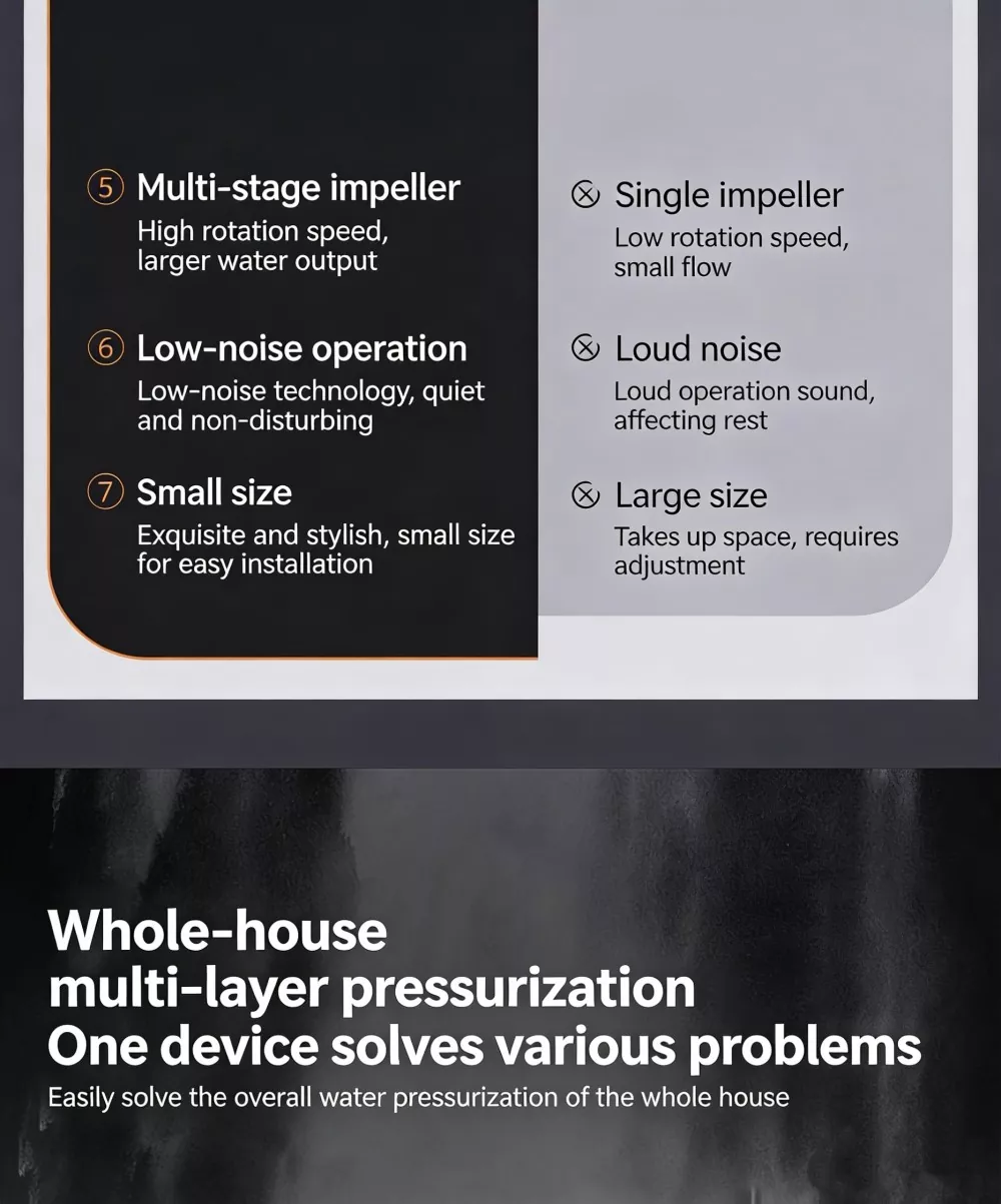 Việc nâng cấp hiệu suất do Bơm tăng áp biến tần nam châm vĩnh cửu mang lại rất trực quan và hữu hình, đồng thời trải nghiệm sử dụng nước đã được cải thiện hoàn toàn trước và sau khi lắp đặt: