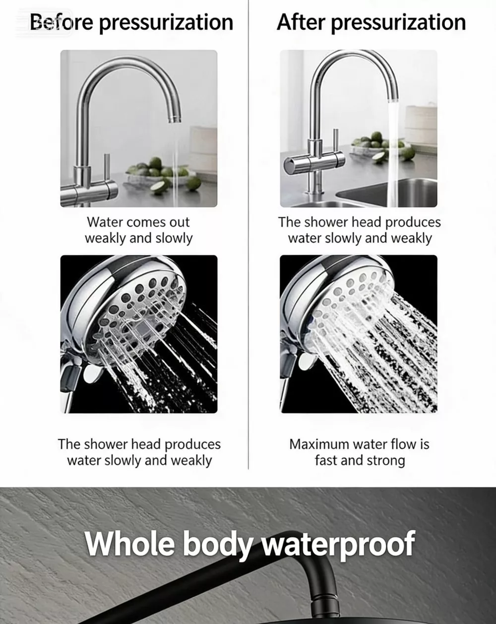 Tăng áp lực đầu vòi hoa sen: Nâng cao trải nghiệm tắm vòi sen, chấm dứt tình trạng dòng nước yếu và thay đổi nhiệt độ nước nóng và lạnh đột ngột.